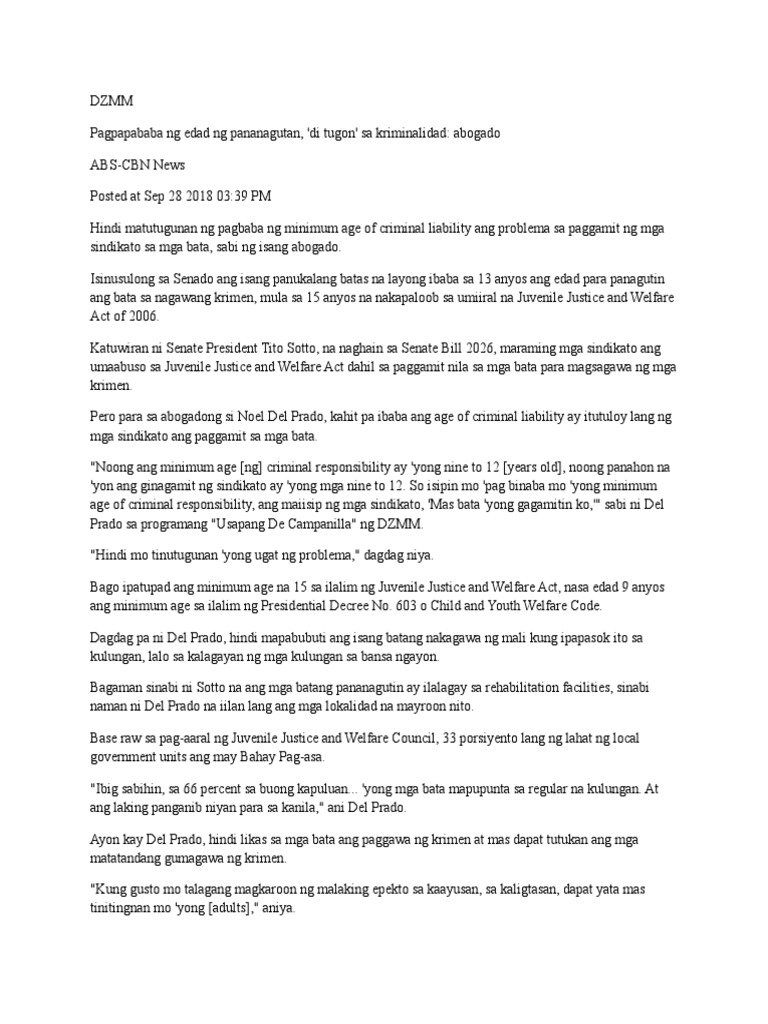 Hindi ito dahil sa Adobo dirty ice cream taho o hopia sa Quiapo. 19092013 Inalis ang parusang kamatayan sa Pilipinas noong 2006 sa ilalim ng administrasyon ni dating Pangulong Gloria Macapagal Arroyo dahil sa paniwalang hindi ito solusyon sa lumalalang krimen sa bansa. 30092018 Criminal liability sa minors kailangan nang tutukan.