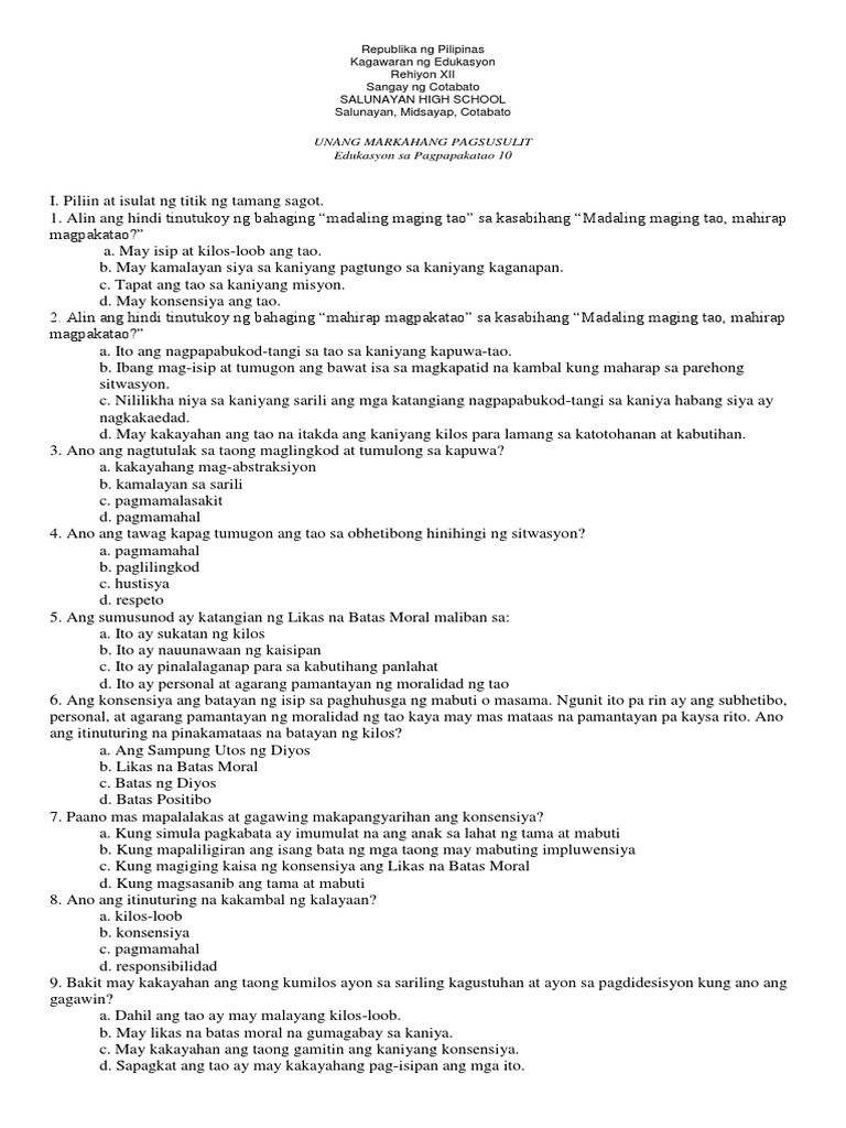 Edukasyon Sa Pagpapakatao 10 1st Qrtr Examg