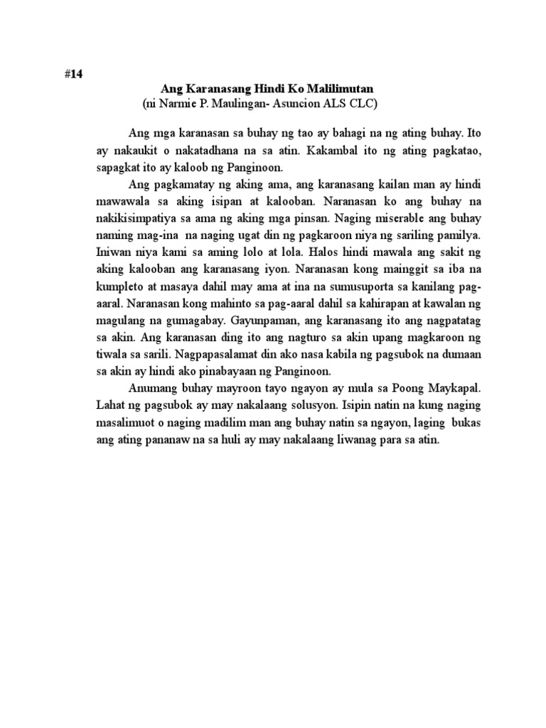 Als Sanaysay Sample Ang Aking Karanasang Hindi Ko Malilimutan