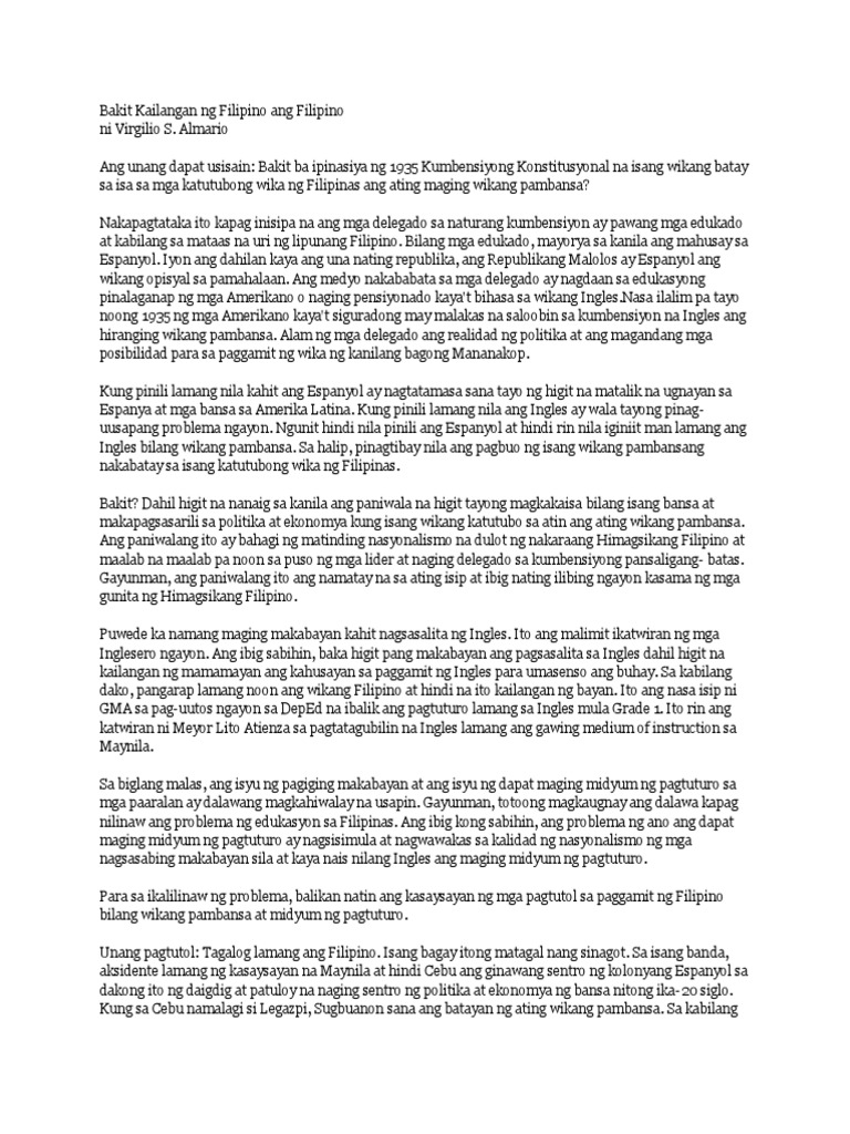 27062014 Pilipino tayo kayat nararapat lamang na mas maging maigi ang pag-aaral natin sa sarili natin at iyan ang wikang Filipino. Walang nagreklamo dahil hindi lamang sila sumunod para palitan ang Pilipino sa Filipino kundi dahil may rason kung bakit ito binago. Minsan isang tanghalian habang ako ay teacher prefect sa aking mga mag-aaral naitanong sa akin ng isa kong estudyante kung bakit pa raw niya pag-aaralan ang Filipino kung magiging CEO naman siya ng kanilang kumpanya balang.